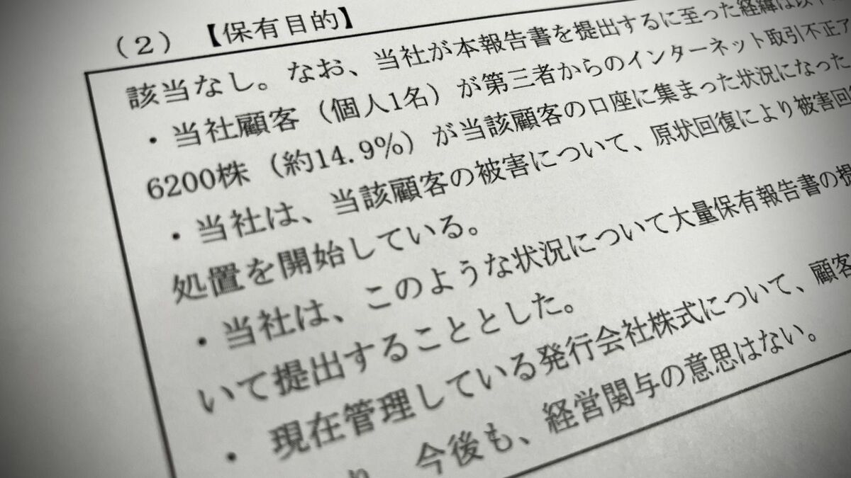 年始から続く証券口座の不正アクセス。口座を乗っ取られて知らぬ間に大株主にさせられた投資家は、自身の保有状況を開示するべきか――。証券会社が補償対応を進める中、新たな論点が浮上している。