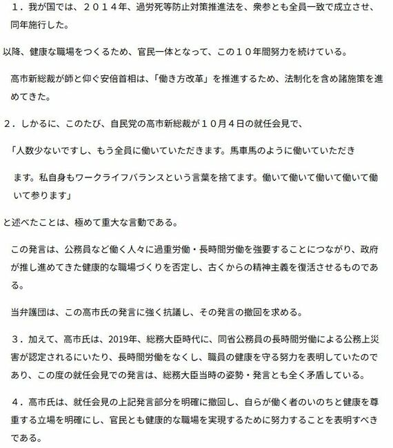 過労死弁護団全国連絡会議は6日、以下の声明を出した。弁護団は、電通で起きた過労自殺の遺族側代理人だった川人博弁護士が代表幹事を務める。声明は「公務員など働く人々に過重労働・長時間労働を強要することにつながり、古くからの精神主義を復活させる」と批判した。
