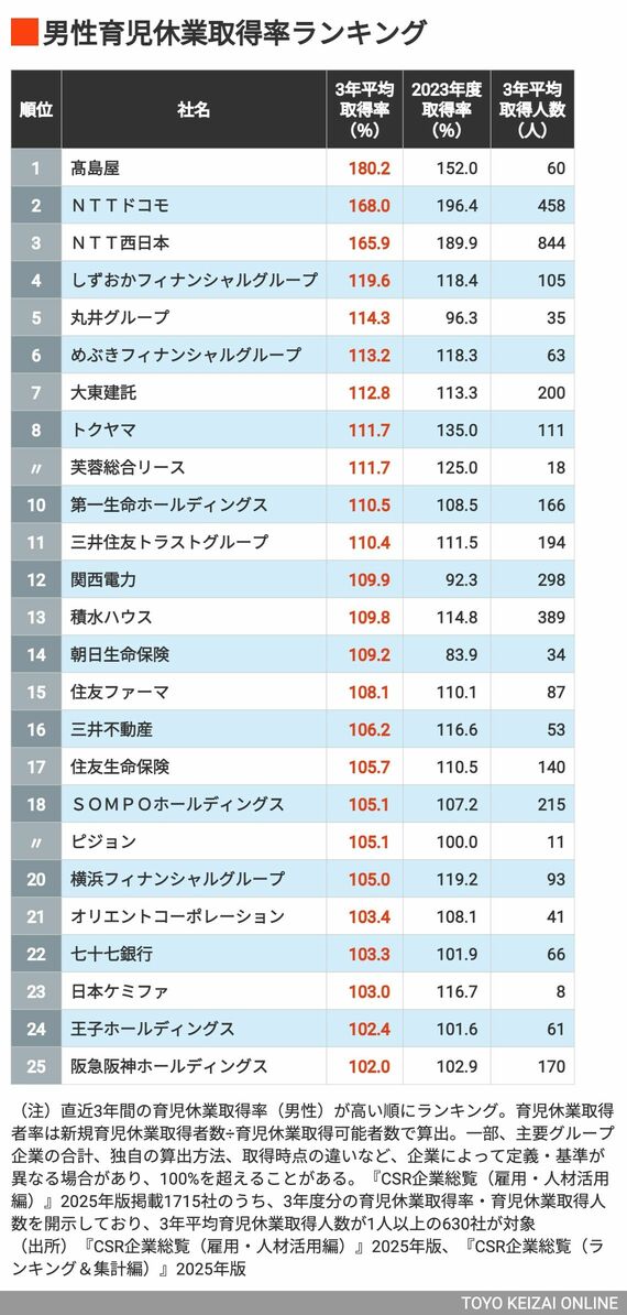 「男性社員の育休取得率が高い会社」トップ100 3位はNTT西日本、2位はNTTドコモ、では1位は?