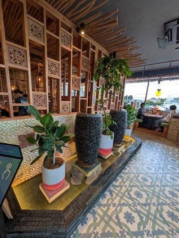 内装は「バリのリゾート」をイメージしているそう。随所に華美な装飾が施されており、確かに海外に来たような、ここが立川のロードサイドであることを忘れてしまいそうになる。席は広々としており、テーブルごとに仕切りがついているので他のお客の様子があまり気にならない。