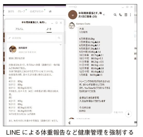 さらに標準体重を上回っている社員には、LINEで体重を報告させ、「もっと歩くように」などと、生活習慣について指導しています。体重管理については、かなり細かく、スパルタで指導します。