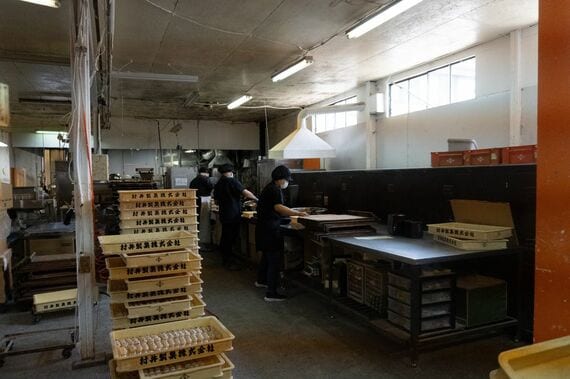 村井製菓は、自社で製造した和菓子を近隣スーパー58店舗(※25年10月現在)に卸す和菓子卸業が主体だ。定番商品は創業時からどら焼き、みたらし団子、田舎まんじゅうなど18種類以上。手で包むあんこ入りの餅であれば1日約1300個、焼き菓子であれば1日約3000個を従業員9人で製造する、大規模な手作業の現場である。