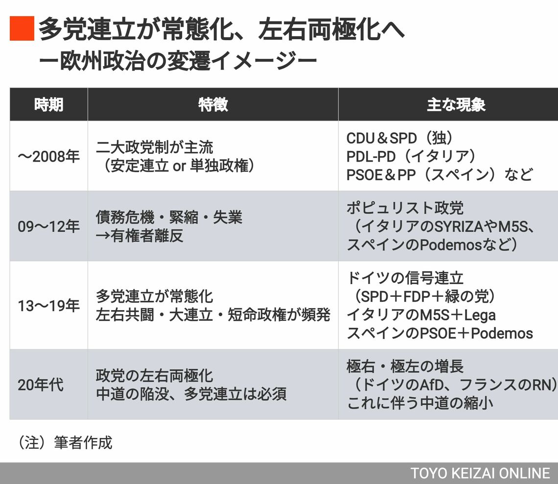 筆者は今年7月、参院選後の自公大敗を受けた顧客向けレポートで「このような光景は2009年に勃発した欧州債務危機以降のユーロ圏で頻繁に見られてきた」と述べ、欧州において、経済が困窮すれば少数与党・多党連立を背景として政局流動化が常態化する実情を振り返った。