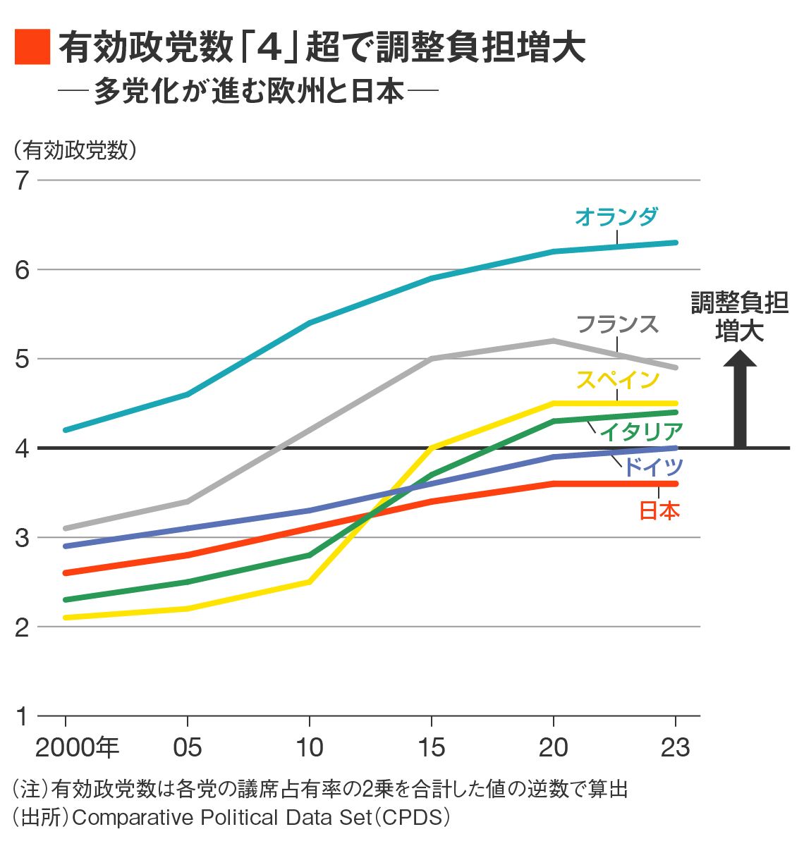 政治学の世界には「有効政党数(ENP:Effective Number of Parties)」 と呼ばれる指標がある(各党の議席占有率の2乗を合計した値の逆数で算出)。数字が大きいほど議会の分裂度が大きいことを示しており、先行研究では「4を超えれば議会における調整負荷が増大し、政権の持続期間も短くなる」という指摘がある。
