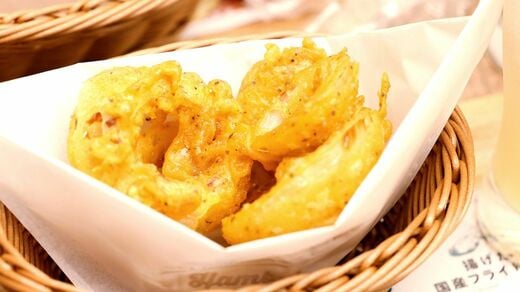 オニオンフライは店で仕込み、注文が入ってから揚げる。外側がカリッとしており、スパイシーな味付けが玉ねぎの甘みとマッチ。カゴいっぱいに盛り付けられているので、シェアしてもいいかもしれない。