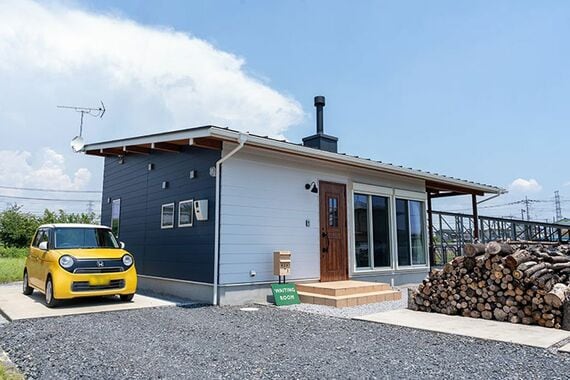 東武伊勢崎線・太田駅から車で20分ほど。群馬県太田市の静かな住宅地の一角にKさん夫妻の住まいはあります。外壁をホワイトとネイビーに塗り分けたキュートな建物は2階のない平屋。屋根からニョキッと伸びた煙突がチャームポイントになっています。