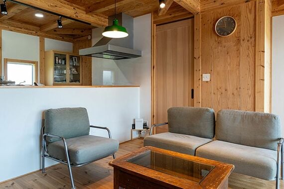 アウトドア好きの2人のこだわりは内装のデザインにも表れています。リビングは床だけでなく、壁や天井にも無垢の木をふんだんに使ってナチュラルな空間に。一面の掃き出し窓から注ぐ光と相まって、山の別荘にいるような気分になります。