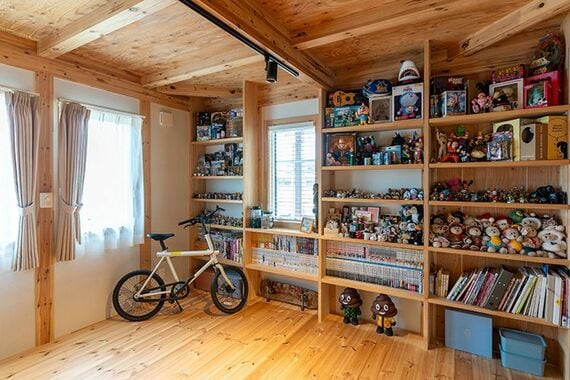 「賃貸に住んでいたときから集めていたのですが、飾る場所がないからずっとダンボールのなか。せっかく家を建てるのだからと専用の棚をつくってもらいました。高さがバラバラなので入れるものを採寸して、寸法や収まりなどを何度も打ち合わせしました。眺めているだけで癒やされますね」と満足そうに見わたします。