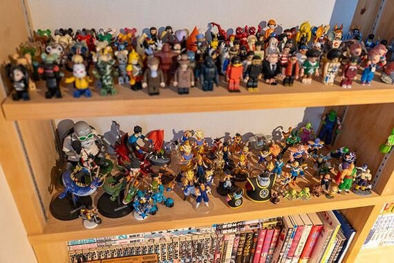 棚一面にフィギュアなどがずら~り。まるでおもちゃ箱のようなにぎやかさです。