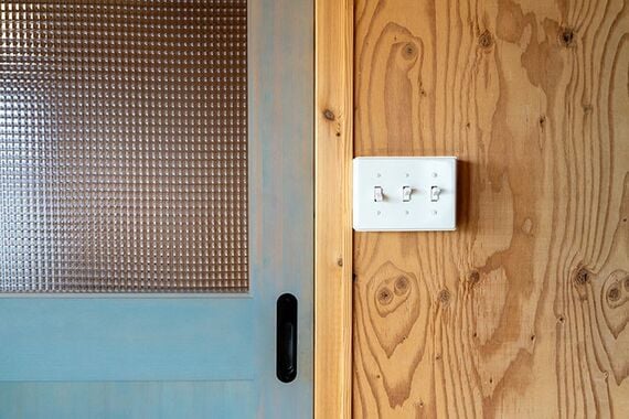 そんなKさん夫妻の住まいはインテリアにもセンスが光ります。リビングと玄関の間につけられたのはオリジナルの扉。無垢材をブルーグレーで塗装し、チェッカーガラスによって光を取り込む工夫がされています。