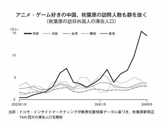 中国ゲーム企業の勢いそのままに、アキバを訪れる中国人も群を抜いて増えている。取材班がドコモ・インサイトマーケティング(東京都豊島区)の協力を得て、携帯電話の位置情報データから、秋葉原駅周辺(1キロメートル四方)にいる外国人の滞在人口を国籍別に解析した。すると、中国からの来訪者は1日当たり約5000人(2024年7月時点)と、韓国や米国などからの来訪者に比べ、5倍程度にも達しており、圧倒していることが分かった。