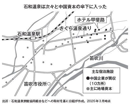 弱る温泉街。買いに出たのが中国資本だった。取材班が、石和温泉にある旅館やホテルなど40の主要施設を対象に調査を試みると、中国資本に買収された施設は、温泉街全体の25%を占め、既に10軒にも達していることが分かった。