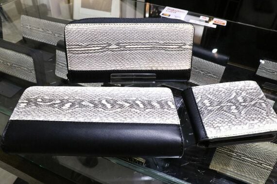 ハブを活用できるのは、そのエキスだけではない。独特の模様を持つ皮を使って商品を生み出しているのが「yu-i FACTORY」だ。ハブ革に特化したなめし技術(動物の皮を皮革製品材料にすること)の開発に初めて成功した。店舗には、財布やカバン、ベルトなどのハブ製品がずらりと並ぶ。