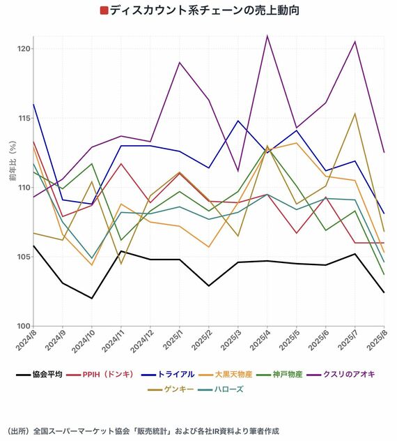 全国スーパーマーケット協会の発表するスーパー売上月次動向と比べて、顕著に上回って推移しているチェーンを抽出した。PPIH(ドン・キホーテ)、トライアル、大黒天物産はディスカウントストア、クスリのアオキ、ゲンキーは、生鮮もあるフード&ドラッグ(食品売上が過半を占めるタイプのドラッグストア)、神戸物産は業務スーパーチェーンの運営会社、そして、食品スーパーで最も伸びが大きいものとして、中四国のハローズも入っている。