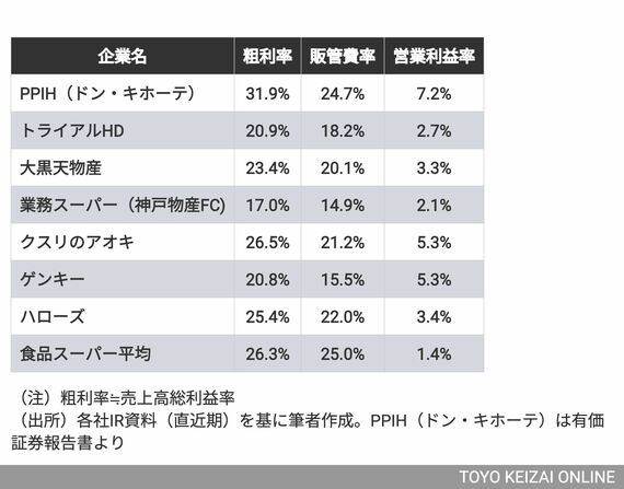 ただ、この表の違和感は、あのディスカウントストア・ドンキのPPIHや、食品が安く買えると評判のフード&ドラッグであるクスリのアオキの2社の粗利幅がスーパーの平均値を上回っていることだ。