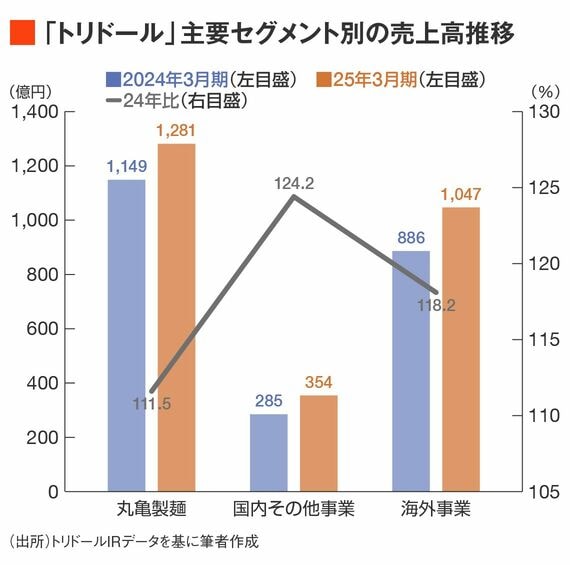 しかし、国内その他事業は前年比124.2%、海外事業が118.2%という数字に比べると、丸亀製麺の伸び率には物足りなさもあります。26年3月期第1四半期でも丸亀製麺は前年比111%と他セグメントに比べると大きく伸びていません。