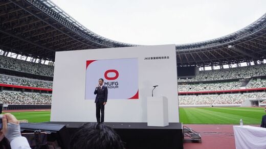 10月15日、国立競技場で開かれた事業戦略発表会。JNSE竹内晃治社長と三菱UFJフィナンシャル・グループの亀澤宏規社長が登壇し、2026年1月から5年間のネーミングライツ契約を発表した。国立競技場は「MUFGスタジアム」の呼称で運営されることになる。