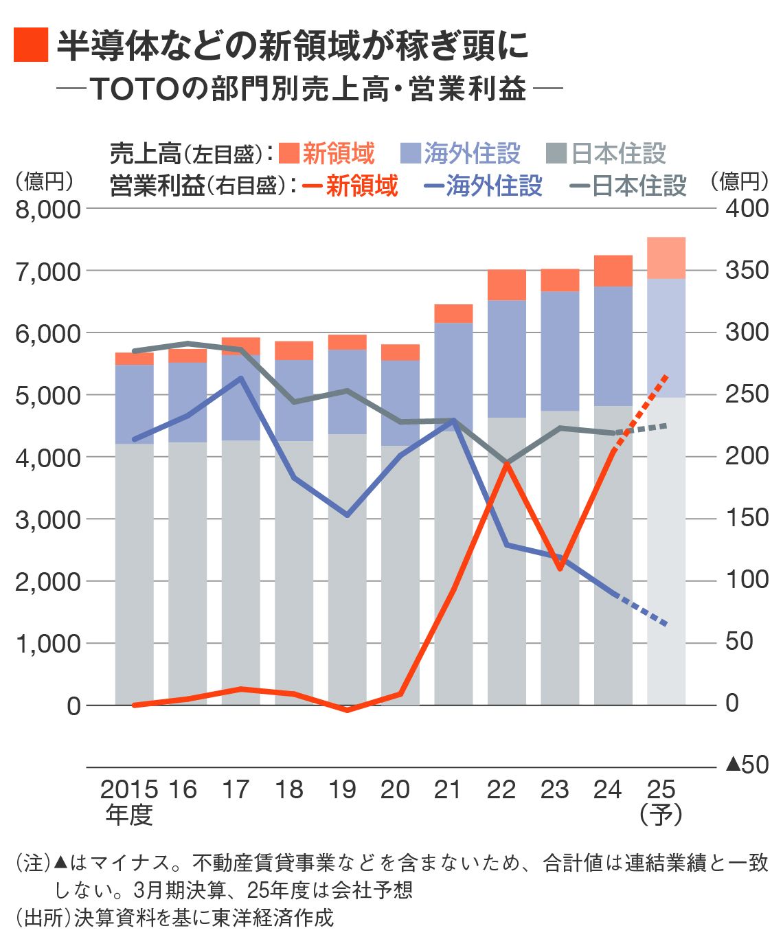 厳しい状況下、新たな稼ぎ頭として急浮上したのが半導体製造装置向け部品を中心に手がける「新領域事業」だ。前24年度の部門営業利益は204億円となり、利益率40%に達した。今25年度はTOTOの連結営業利益525億円のうち新領域事業は265億円を見込んでおり、日本住設の225億円を上回る計画となっている。