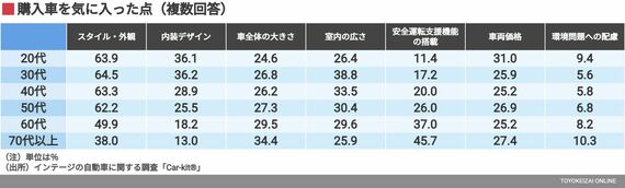 クルマ選びの価値観の変化として顕著に表れているのは、見た目に関連する「スタイル・外観」「内装デザイン」といった点が、年齢を重ねるとともに低下していることだ。