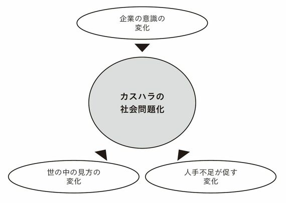 それではなぜカスハラ問題がより表に出るようになったのでしょうか。それは、私の分析によれば下の図に示した3つのポイントに整理できます。