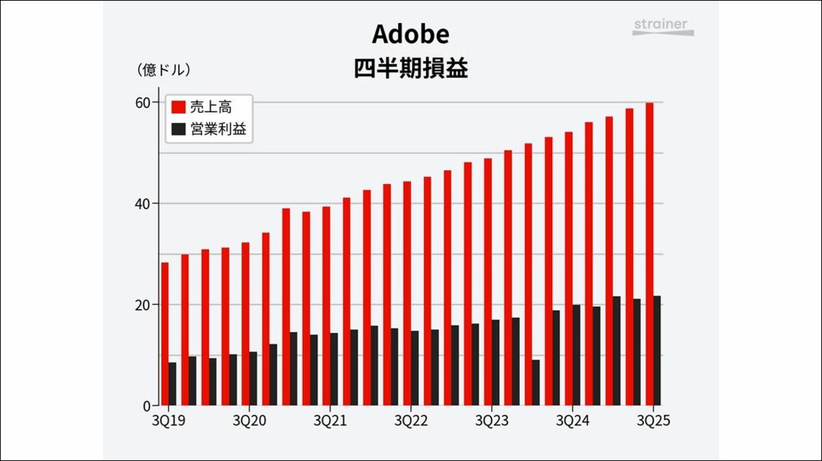 Adobeが9月11日、2025年6〜8月期決算を発表。売上高は過去最高の59.9億ドル(前年比11%増)、営業利益(GAAPベース)は21.7億ドルでした。希薄化後1株当たり利益(GAAP)は4.18ドル(前年同期比11%増)となり、2025年度通期の売上およびEPSの目標を引き上げています。