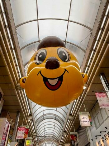 アーケードから吊り下げられたパルム商店街のマスコット「パル」(筆者撮影)