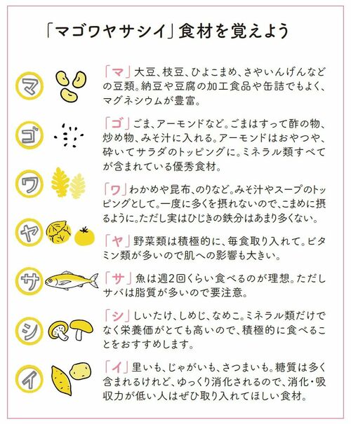 頭文字をとって「マゴワヤサシイ」食材を意識して摂るようにしましょう。