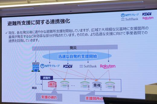 能登半島地震では、各社が独自に動いた結果、同じ避難所に複数社が入る一方、別の避難所は支援が遅れた。「発災後、時間が経つほど重複が多くなるという肌感覚があった」。NTT技術企画部門災害対策室長の倉内努氏は、記者会見でこう振り返った。