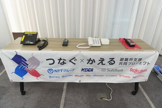 各社が避難所に持ち込む支援パッケージは、災害時用充電スポット、00000JAPANのフリーWi-Fi、衛星やモバイル回線を通信回線として使う電話機だ。契約キャリアに関係なく、被災者全員が使える。このセットを避難所ごとに分けて配る。