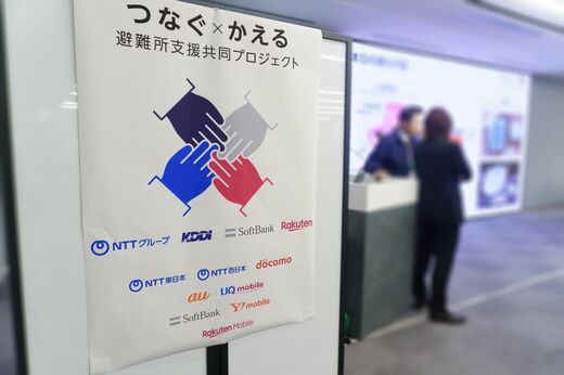 4社は共通ロゴも作った。NTT、KDDI、ソフトバンク、楽天モバイルのコーポレートカラーを4つの手の色にし、中心に向かって重なるデザインだ。避難所支援や防災訓練で掲げ、通信事業者全体でやっていることを伝える。