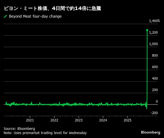 22日の米時間早朝の時間外取引で、代替肉製品を手掛ける米ビヨンド・ミートの株価が2倍以上に急騰し、4営業日での上げが約14倍となる勢いだ。定期的に市場に訪れるミーム株の熱狂をほうふつとさせる展開だ。