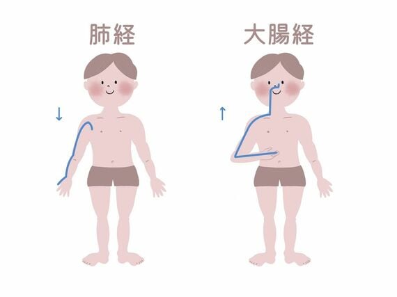 肺の経絡(けいらく:気の通り道)は、腕の内側を親指先に向かって通っています。また、先に挙げた肺と関連する大腸の経絡は、肺の経絡の反対側、腕の外側を通っています。