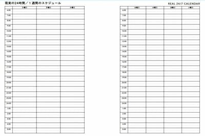 最初のスケジュールには、あなたが実際に使っている時間を記入します。もし規則正しい生活を送っているのなら、まとめて記入できるでしょう。スケジュールがよく変わるなら、1日ごとに記入して、1週間がどんなふうになるか見てみましょう。