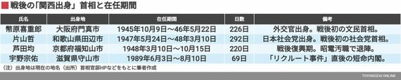 高市氏の属性で、もうひとつの注目点は「関西人」であることだろう。奈良県出身では初の首相となるが、戦後の首相で関西出身者はきわめて少ない。彼女は5人目であり、実に36年ぶりの関西人首相となる。