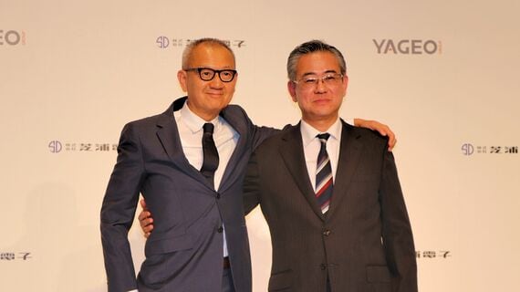 壇上に立ち並び、満面の笑みで熱い抱擁を交わす2人の男。カメラのシャッター音が鳴り響く中、「相思相愛」ぶりを報道陣にアピールしたのは、台湾の電子部品大手・国巨(ヤゲオ)のピエール・チェン会長と、日本の温度センサー大手・芝浦電子の葛西晃社長だ。