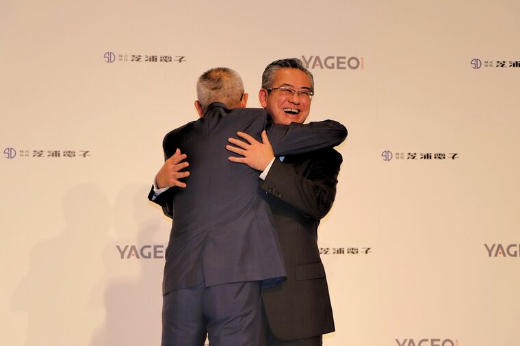 会見ではヤゲオのチェン会長と芝浦電子の葛西社長が抱き合うなど「相思相愛」ぶりをアピールした(記者撮影)