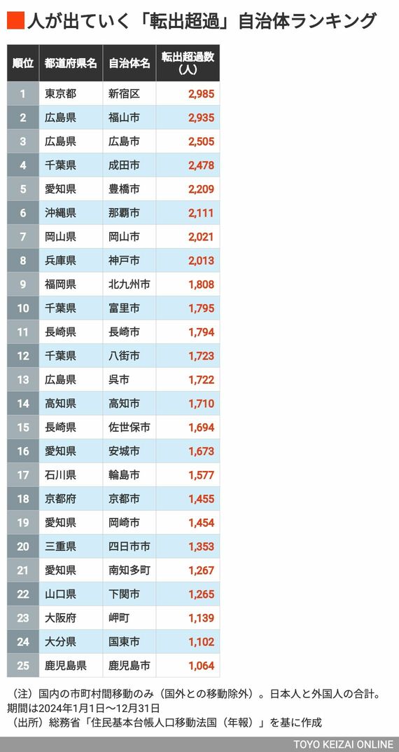 出て行く人が多い「転出超過」自治体ランキング 5位は愛知県豊橋市、4位千葉県成田市、ではトップ3は?