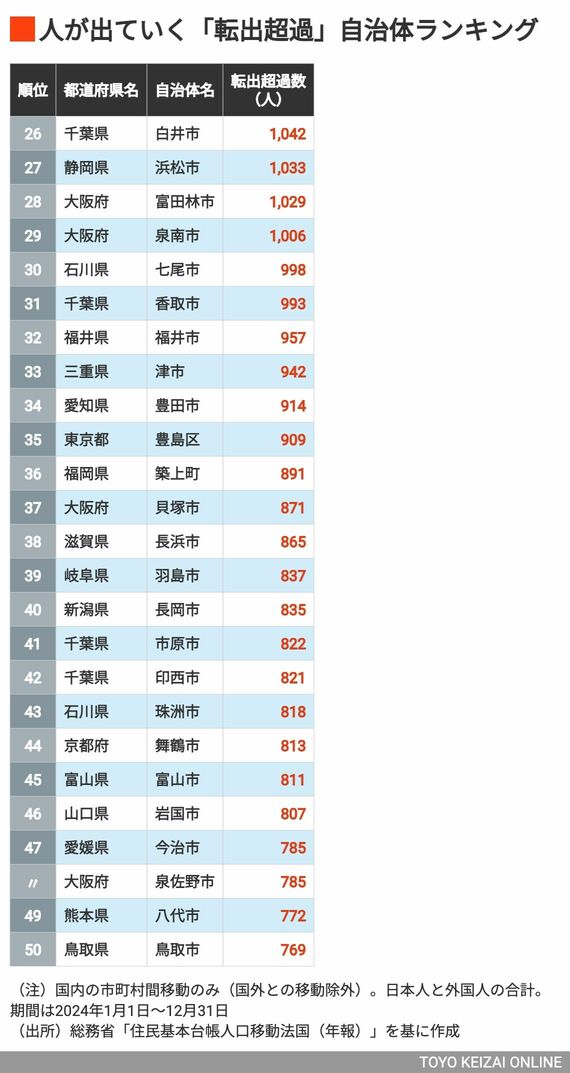 出て行く人が多い「転出超過」自治体ランキング 5位は愛知県豊橋市、4位千葉県成田市、ではトップ3は?