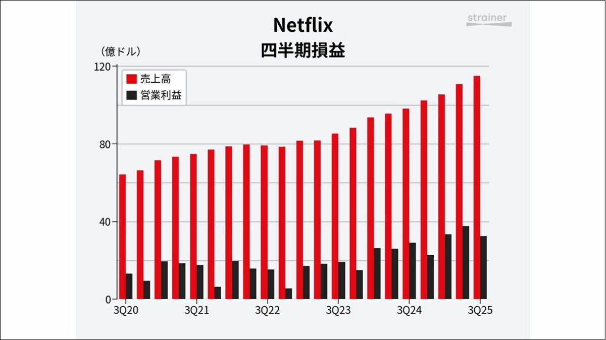 Netflixが10月21日、2025年7〜9月期(Q3)決算を発表しました。売上高は前年同期比17%増の115億ドルとなり、概ね会社予測通りに着地。しかし、営業利益率は28.2%となり、ガイダンス(業績予想)で示していた31.5%を下回りました。