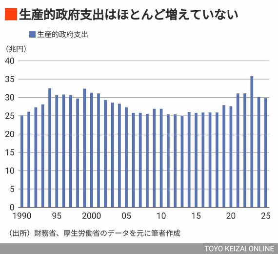 この生産的政府支出が長期間にわたって伸びていないことが大きな問題です。1990年度には25.1兆円だった生産的政府支出は、1994年度に初めて30兆円を達成して以降、ほぼ横ばいで推移しています(下図表)。