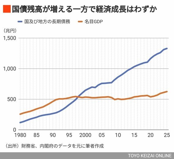 これまでの日本政府の動向を見ても、多額の政府負債が増加したにもかかわらず、GDPはあまり伸びていません。積極財政を危惧する人々は、対GDP政府負債が上昇し続けていることから、今までの財政出動がGDP成長につながっていない事実を特に強調します(図表)。