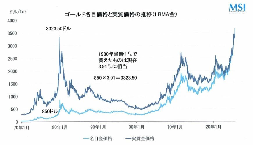 東西冷戦期は、核戦争や第3次世界大戦に対する懸念が強まる時期がありました。1979年12月に旧ソ連のアフガニスタン侵攻が起きた直後の1980年1月には、金価格が1オンス850ドルと当時の史上最高値をつけます。これは、現在のドルの価値だと3323.50ドルに相当します。「有事の金」と呼ばれるようになったのは、このように軍事的な緊張が高まっていた東西冷戦下でのことでした。
