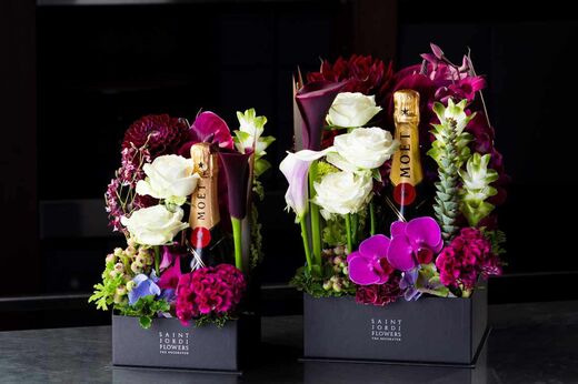目上の方へのギフトは、確かな品質と品格が求められます。完全受注のオーダーメイドのフラワーギフトを提案する花屋、サンジョルディフラワーズ ザ・デコレーターの「シャンパンボックス」は、まさにその条件を満たす一品。