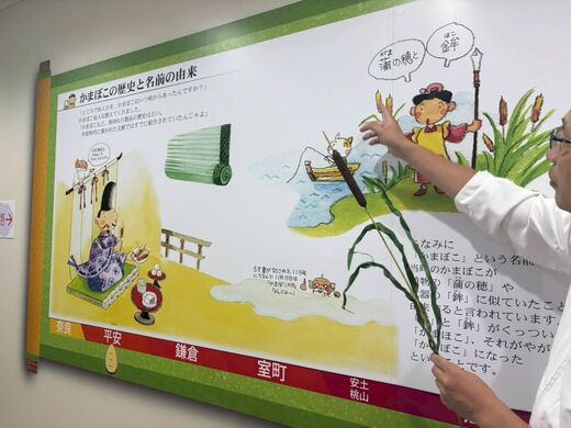 最初のコーナーでは、「かまぼこ」という名前の由来を学ぶ。諸説あるが、平安時代に魚のすり身を竹に巻きつけて焼いた姿が「蒲(がま)の穂」に似ていたことから「かまぼこ」と呼ばれるようになったといわれている。また、形が武器の「鉾(ほこ)」に似ていたことから「蒲鉾(かまぼこ)」と書かれるようになったとも。