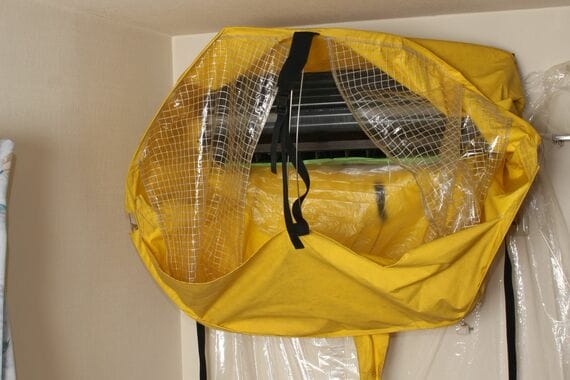 清掃は、専用薬剤を噴霧して汚れやカビを浮かせたあと、高圧洗浄機でエアコン全体を洗い流します。サービスによってはフィルターやカバー、羽根などをお風呂場や業者持参の大きなバケツで手洗いしてくれます。お風呂場を使うかどうかは、予約時に確認してください。