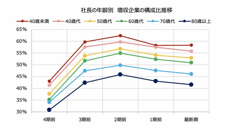 最新期の増収企業率は、「若手社長」と定義した「40歳未満」が58.3%で最大だった。為替や金利動向など経営環境が目まぐるしく変化するなか、柔軟な思考で顧客ニーズをくみ取ることでトップラインを伸ばすことに成功する企業が多い。コロナ禍で業績が低迷した企業が多かった4期前から、5期連続で40歳未満の増収企業率がトップを維持している。