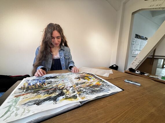 今年の5月、スペイン・バルセロナから堀川団地に2週間、アーティスト・イン・レジデンスしたアビゲイル氏は、「鴨川、御苑、相国寺など団地から徒歩あるいは自転車で行けます。朝、鴨川で見た風景がすばらしかった」と、創作意欲を刺激されたと目を輝かせた。