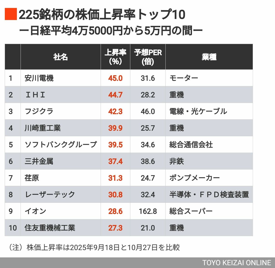 4万5000円時点からの225銘柄上昇率上位には、ソフトバンクグループをはじめとするおなじみの値がさ株に加え、防衛銘柄、AI・データセンター関連銘柄が顔をそろえた。(上昇率10%以上の51銘柄ランキングを記事末尾に掲載)