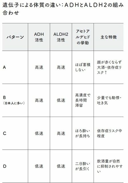 アルコール依存症:ADH1B高活性型+ALDH2活性型の組み合わは依存症リスクが高い傾向。