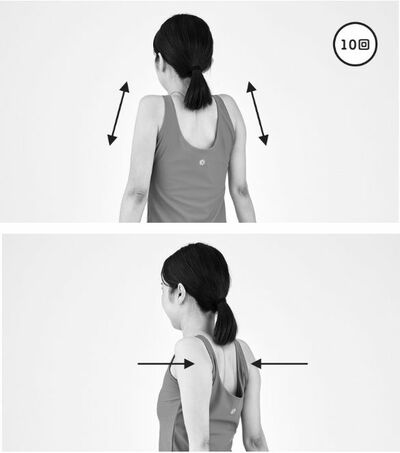 両肩を上に上げて、下げてを10回繰り返し、今度は両肩を上げたら肩甲骨同士を寄せて肩を後ろに持っていきます。そこからストンと下げる。